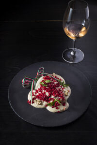 La nogada que lo cubre es otro elemento cuidadosamente trabajado. Se elabora con nuez de Castilla cruda, un generoso toque de Jerez y queso cotija, un ingrediente que, aunque no es habitual en todas las recetas, en Balcón del Zócalo se repite en varios platillos por su intensidad y frescura. El resultado es una nogada equilibrada, ni dulce ni salada, que envuelve al chile sin opacarlo. El montaje respeta la tradición con nueces frescas como recordatorio de la calidad de los ingredientes, perejil, granada abundante y un listón tricolor que celebra las fiestas patrias con elegancia.